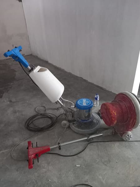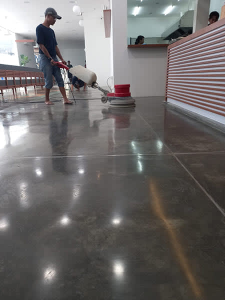 Proses poles kilap bertahap menggunakan *diamond pad* yang semakin halus untuk memunculkan kilap alami (*glossy*) dari lantai acian semen.